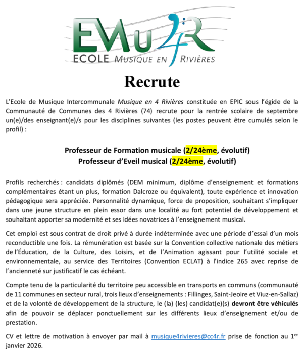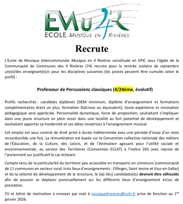 L’Ecole de Musique Intercommunale Musique en 4 Rivières constituée en EPIC sous l’égide de la Communauté de Communes des 4 Rivières (74) recrute :