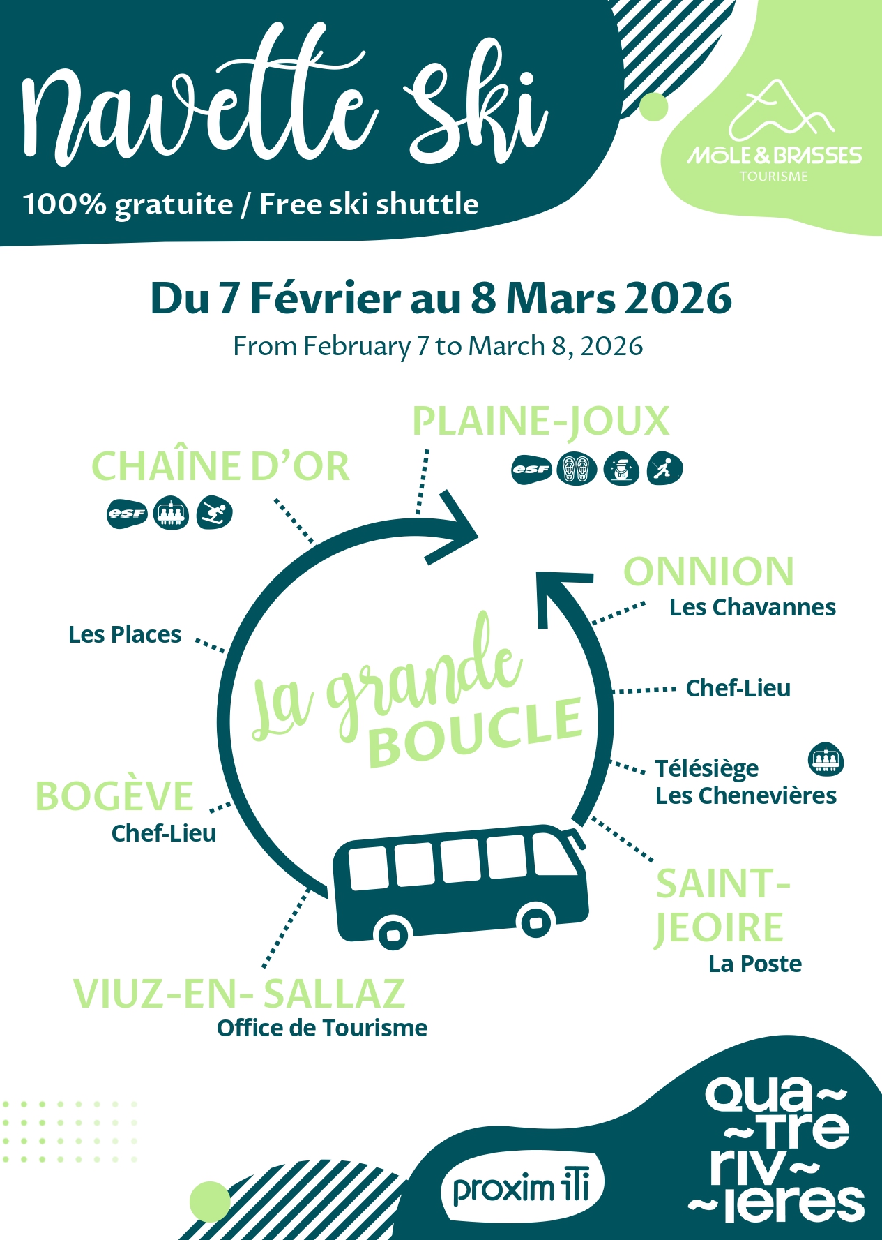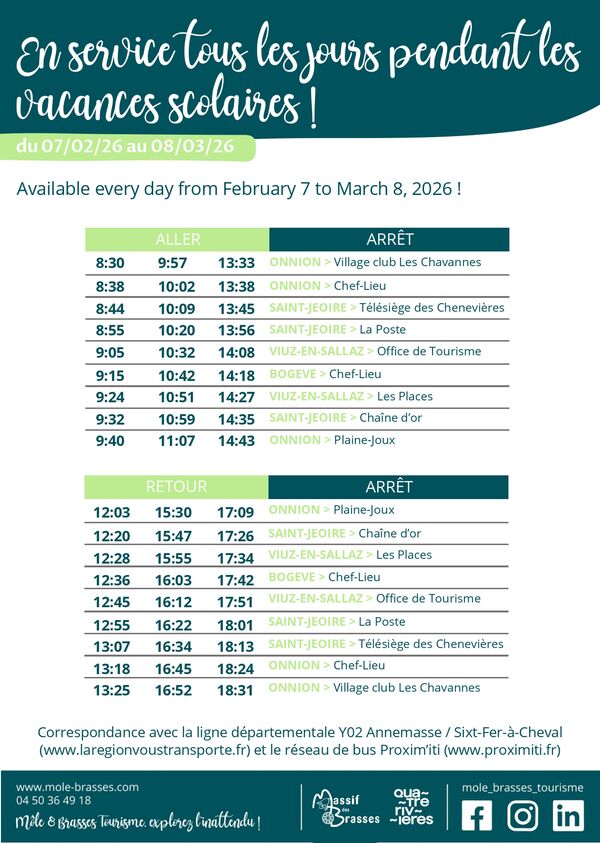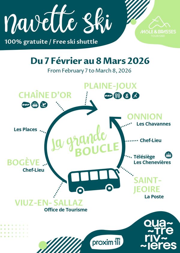 La navette ski circulera du 7/02/2026 au 8/03/2026 pour désservir les villages et la station du Massif des Brasses.